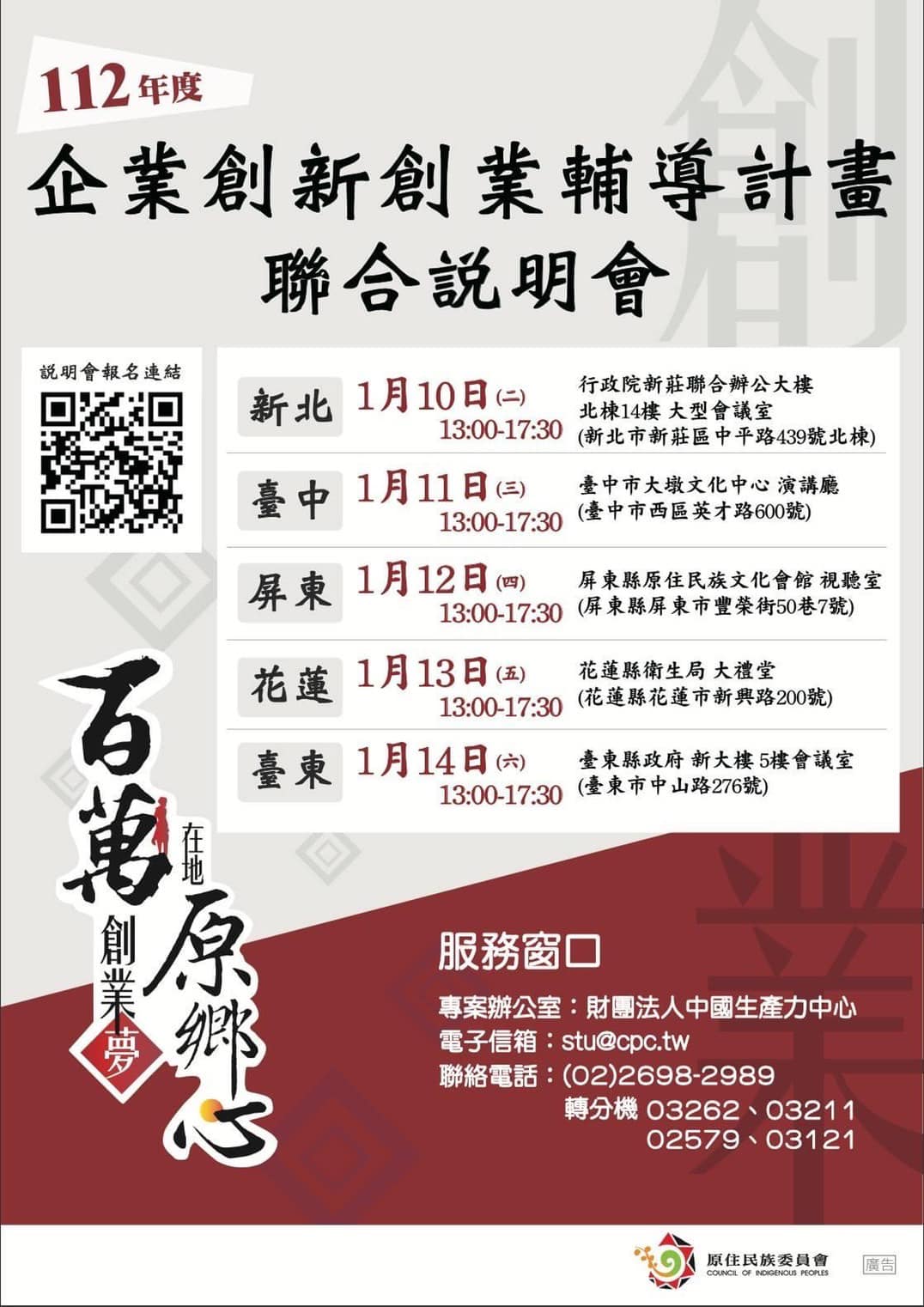 #原民會 【112年企業創新創業輔導計畫聯合說明會(花蓮場、臺東場)】