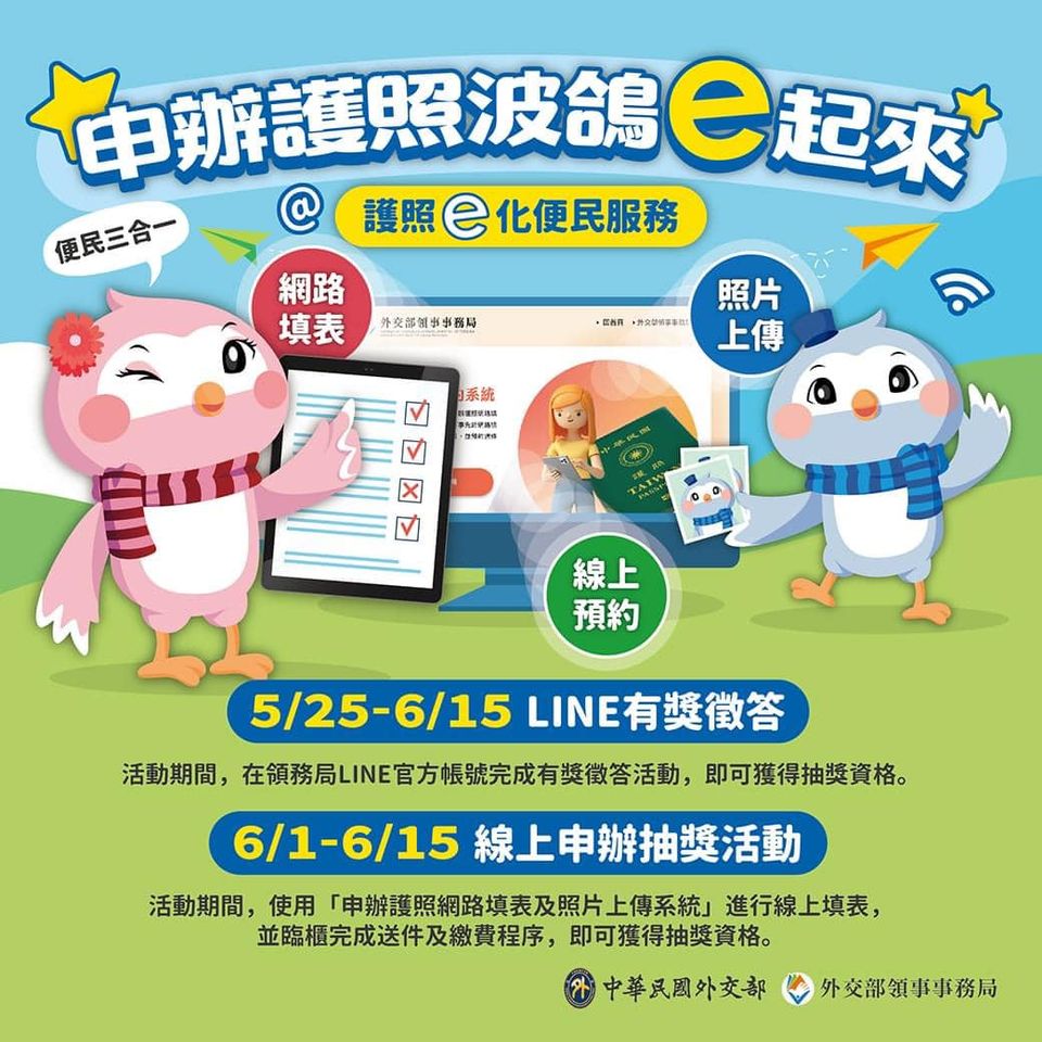 為了介紹並鼓勵國人多加使用這項新的便民服務,領務局今日起舉辦「申辦護照波鴿e起來」活動,凡自今日起至6月15日止使用「申辦護照網路填表及照片上傳系統」,並臨櫃完成送件程序者,即有機會獲得限量精美護照封套。另外領務局Line官方帳號也將同步進行有獎徵答活動,有機會抽中波鴿意象精美禮品,數量有限,歡迎踴躍參加。