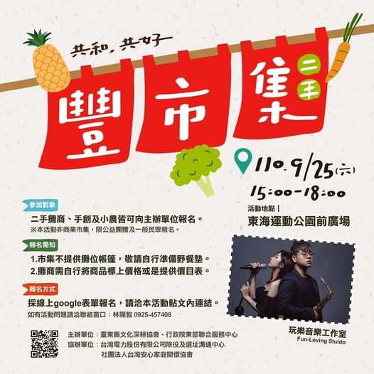 由東服中心共同承辦的豐市集因疫情停辦一屆,讓各位久等了,一季一度的豐市集準備在九月底再度登場。