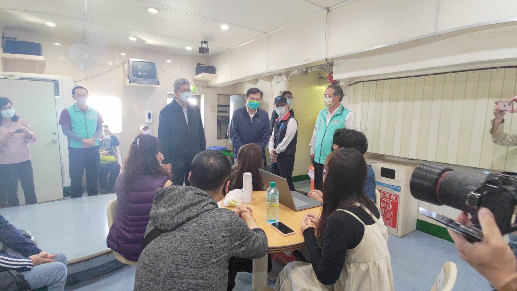 東服中心副執行長郭應義與交通部王部長登船慰問搭船民眾